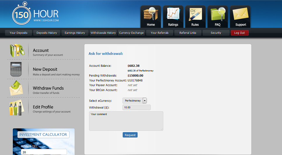 Our company is involved in a highly profitable investment and trading operations and engaged in attracting private capital for the development and improvement of work strategy in the financial markets, basically in forex and stock market. This strategy is widely used in practice for more than five years. 150 Hour company uses a sufficiently large number of trading instruments to achieve the maximum acceptable results.Our system works like this: You assist, but in turn, also have every right to receive assistance in a larger size according to the marketing plan (4% to 7% daily for 30 days)