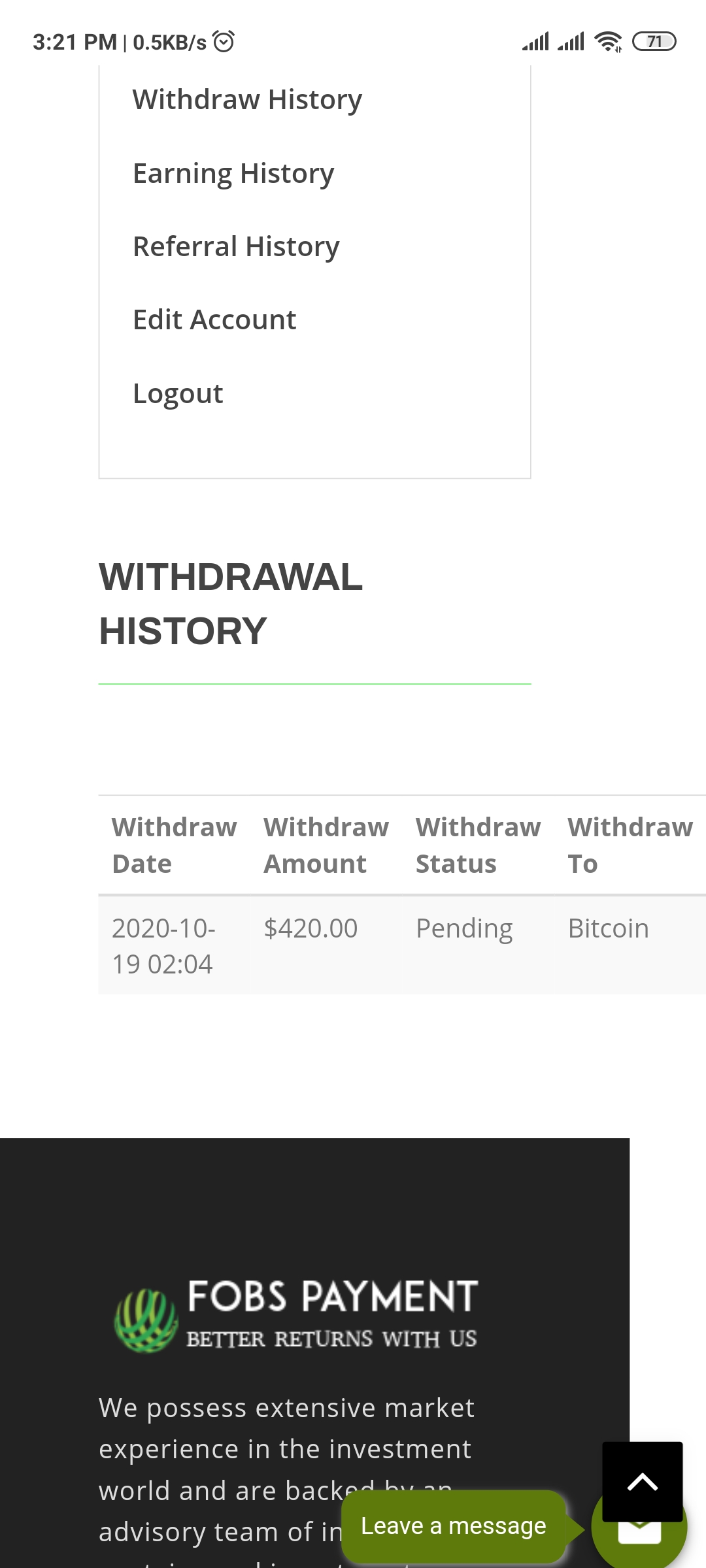 FOBS Payments is not paying or is selctive in payments. My $300 investment matured, I was hoping to receive as Fobs indicated that it pays MANUALLY. But I was told that my payment is automated and that I need to pay another $501 into the next line of investment to get (UNPEND - whatever that means) my $300 investment which was supposed to have become $420 withdrawal order I submitted out. It's been 9 days since I got scammed by Fobs. I don't know what to do! Should I try the $501 UNPENDING investment (which I don't have right now) since almost every other person says FOBS is PAYING or it is just a way to sink me further? POBS MANUAL PAYMENT SYSTEM BECAME AUTOMATIC WHEN IT WAS TIME TO PAY ME AND I STILL DIDN'T GET PAID!!!
