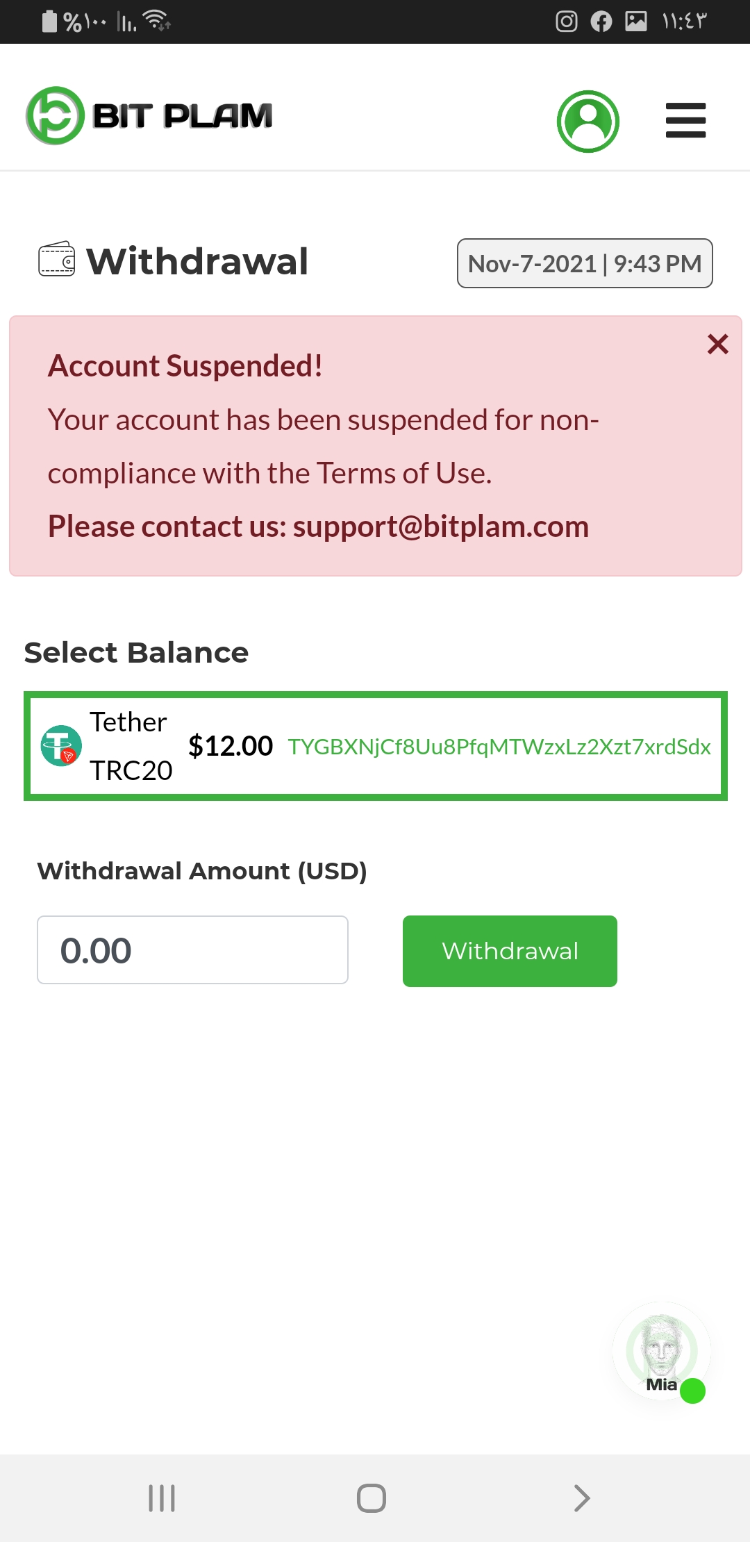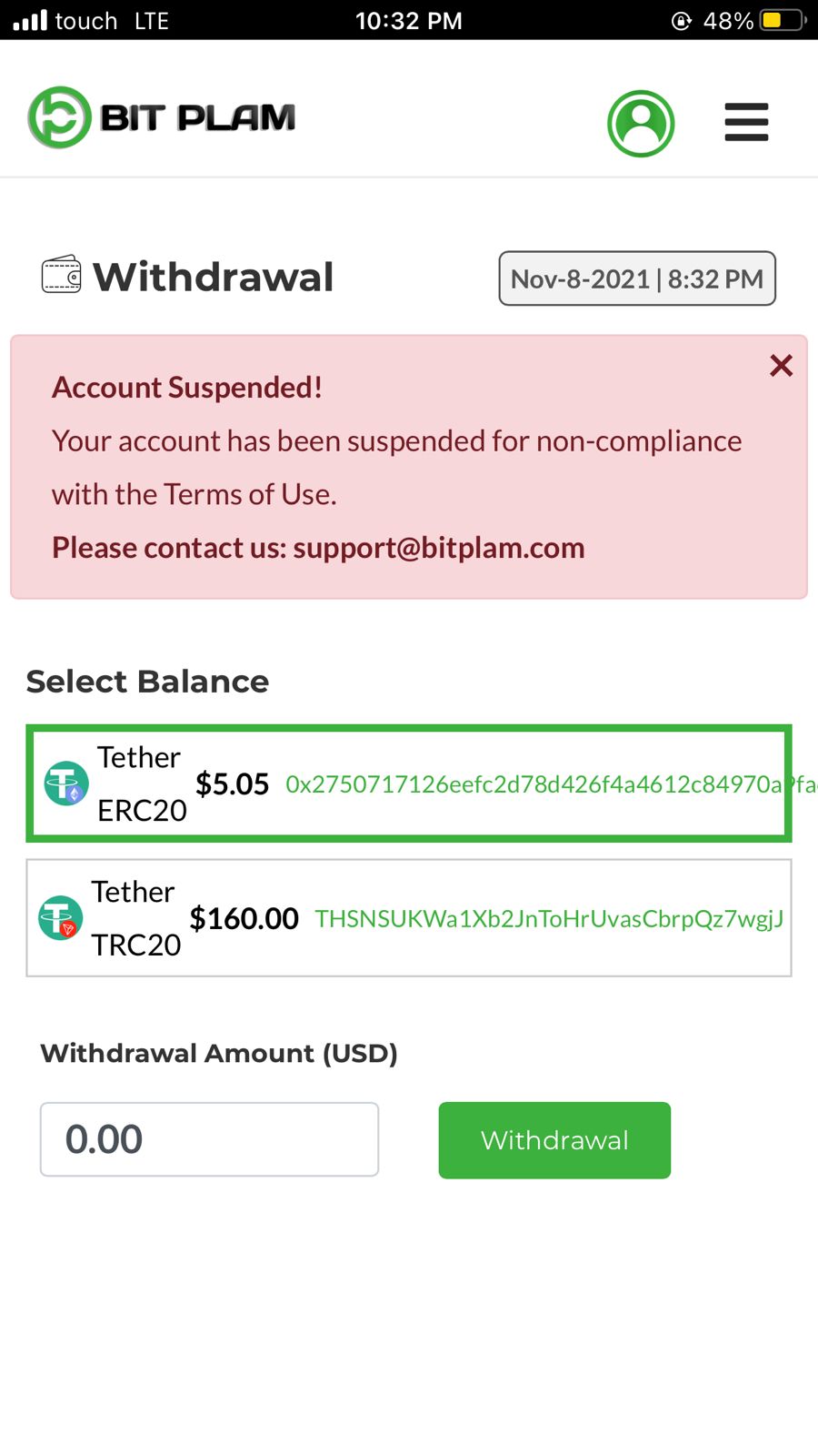My account was suspended without any reason and knowing that I invested only two days ago, scammers, beware of Bitplam.com I and my friends will launch a campaign against them on all sites