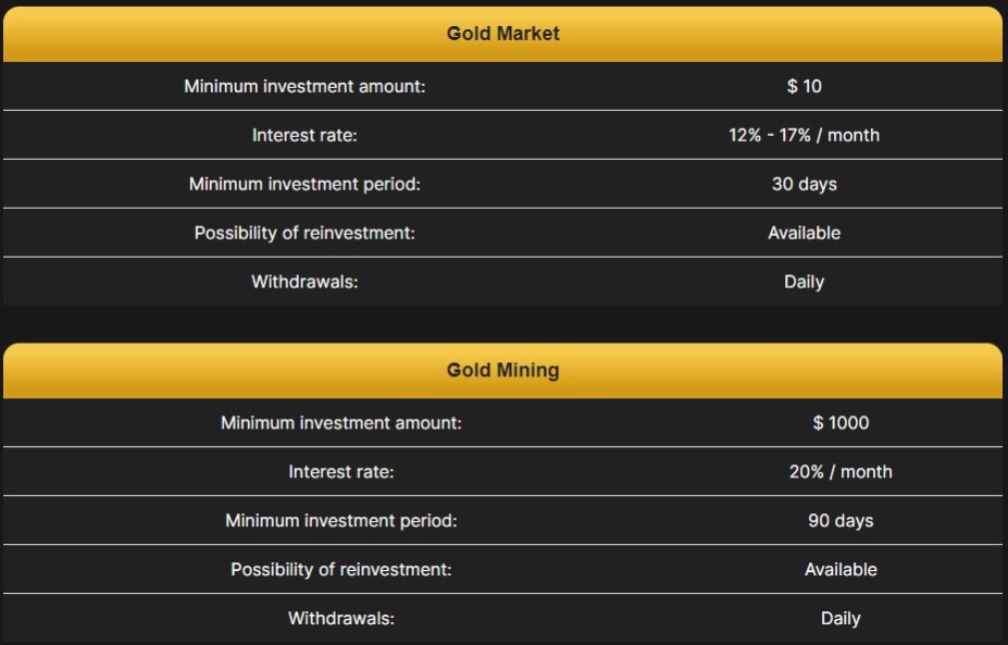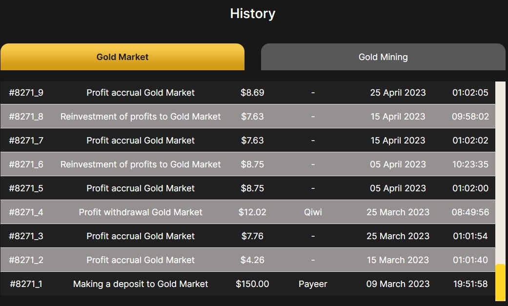 Gold Market 0.55% per day or (from 12% to 17% per month) for 30 days. Return of the deposit at the end of the term. Min. deposit: from $10