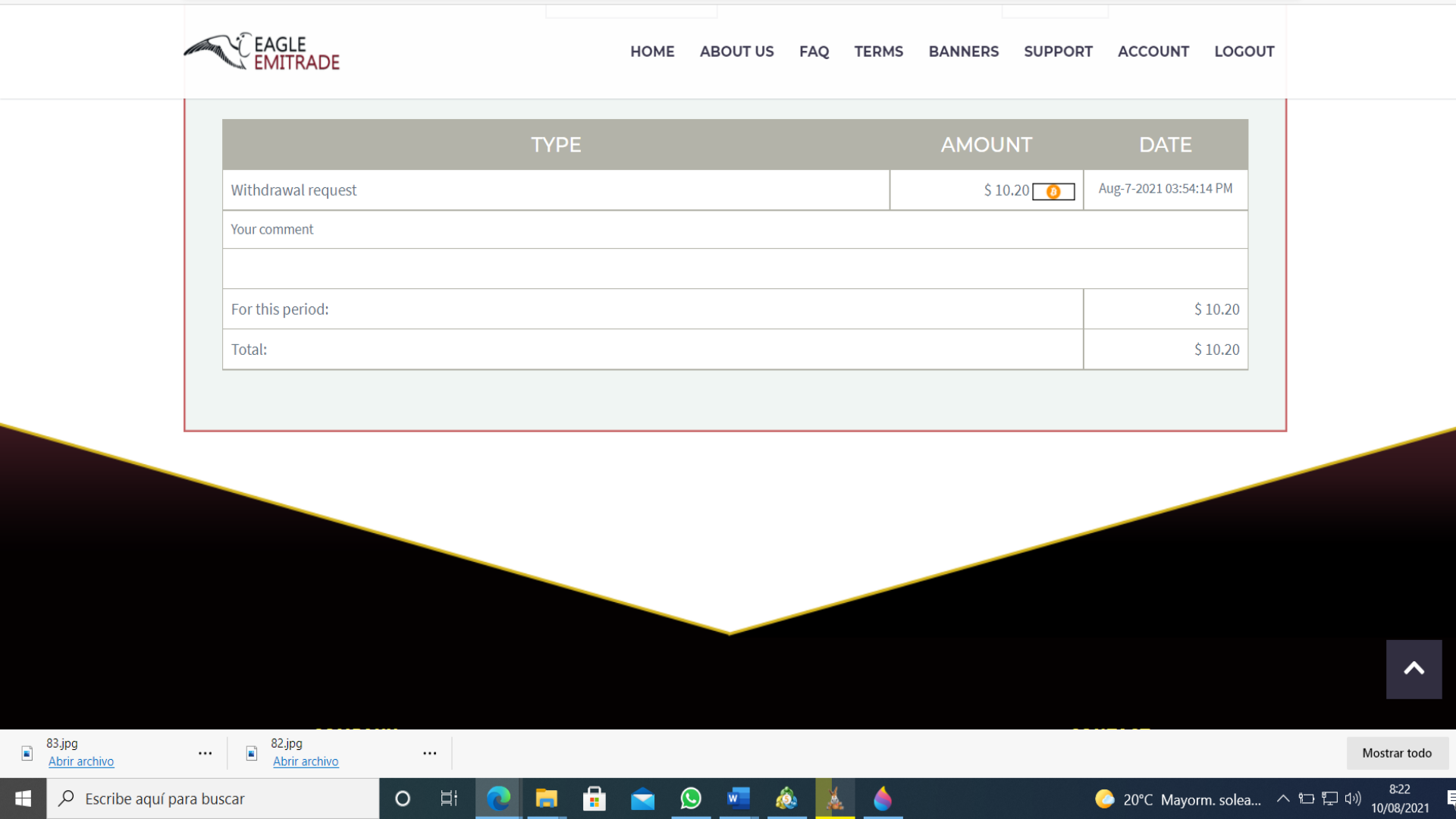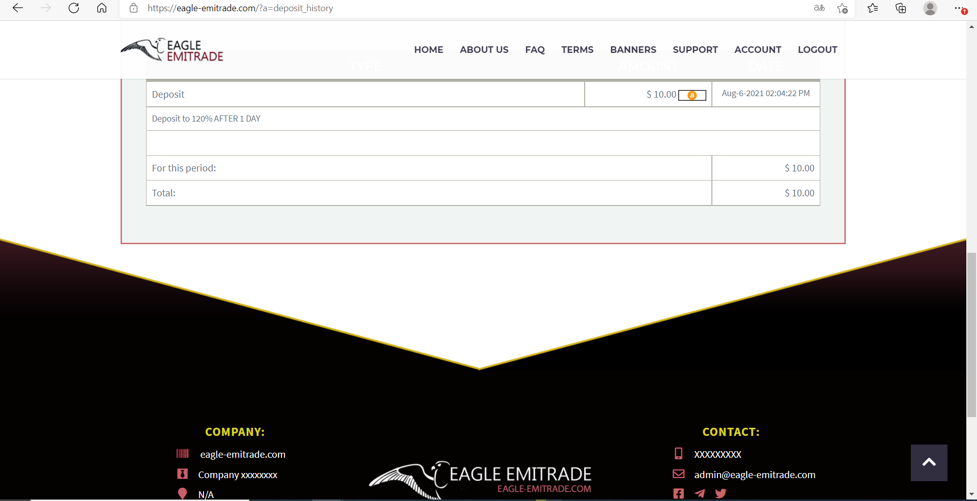 | Eagle Emitrade eagle-emitrade.com is a new, well-developed company in the field of cryptocurrency trading and mining. We are a well-coordinated team that knows their job, thanks to our professional experience, we easily achieve good results in trading on exchanges, we use the latest technologies in in the field of coin mining. Due to the diversification of our investment portfolio, we achieved minimal losses, we developed our own strategy for trading on crypto-exchanges. Even with the fall of the most popular coins, we are still out of competition. |