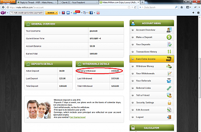 I withdrawn march 21,2013 amount of $199 then several hours later my pending withdrawal went back to my account balance, why would they return my pending withdrawal back to my account , I tried to withdraw again March 22,2013 and I'm still waiting for my payment still pending. According to sir Henry Holden on their face book page we have to wait for 48 hrs. for our payment to be processed. All we need to do for now is wait, and hopefully make-million will solve this matter.