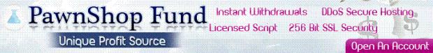 | PawnShop Fund PawnShop-Fund Is a brand new concept hyip introducing in the hyip industry a new profit source generated by the pawn shops owned by our company. The website is hosted on a DDoS secured hostintg with 256 BIT SSL connection, with instant withdrawal and live support features. We have implemented features like EmergencyWithdraw or the minimum deposit terms which allows you to customize your deposits and your earnings. |