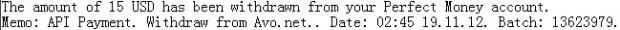 The amount of 20 USD has been deposited to your Perfect Money account. Memo: API Payment. Withdraw from AVO INC.. Date: 04:21 24.09.12. Batch: 11886633.