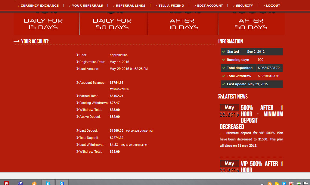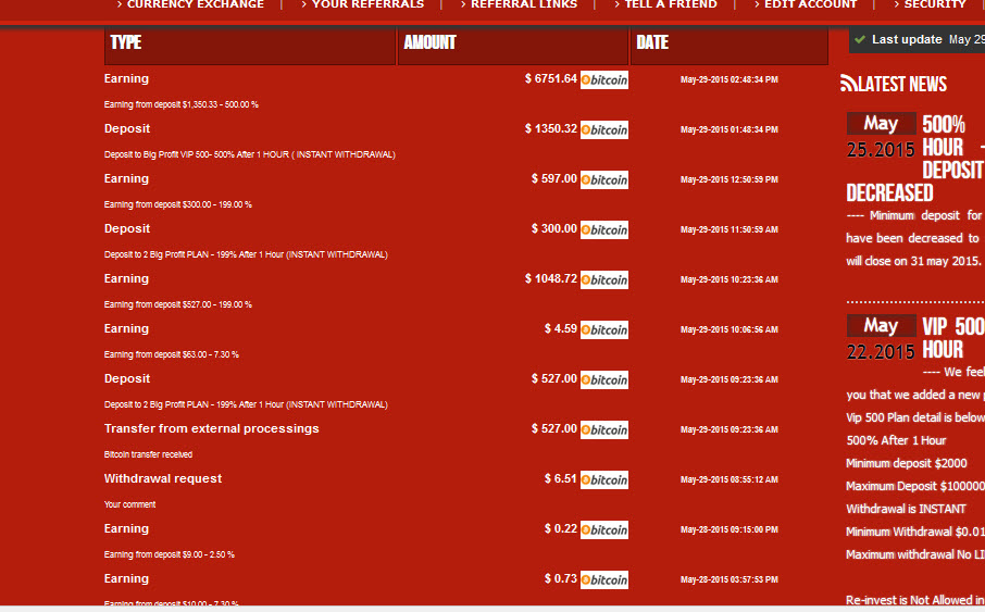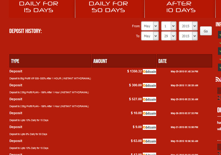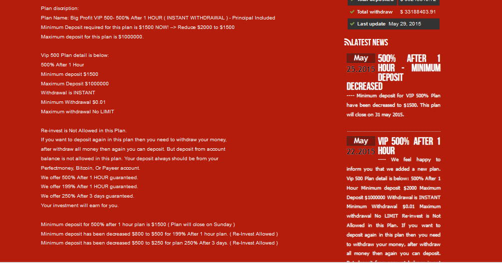 | 2bigprofit 2bigprofit.com is an investment firm legally registered in England and Wales. Our investments are mainly tied in the stock, currencies, bond and gold trading have performed incredibly well over the last years.DouBle Your MoneY1000% Legit SiteNo CHance Of LosssInstant Payments10% Daily for 15 days,8% Daily for 50 days,150% After 10 Days,1000% after 50 day,Referrals bonuses: 3%-2%-1%-1%-1%Payment Methods: PerfectMoney, Bitcoin, Payeer (Solidtrustpay and Payza coming soon) |