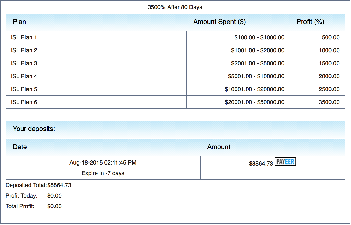 I invested that 8864.73$ on the 3 days plan, and they moved it to 80 days without my concern. The 80 days plan finished yesterday, and I didn’t earn anything.