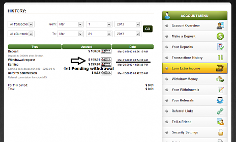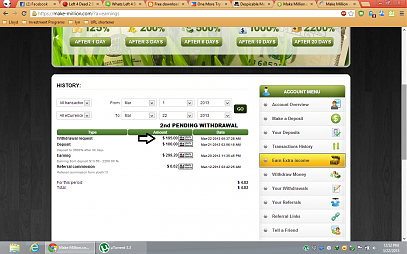 I withdrawn march 21,2013 amount of $199 then several hours later my pending withdrawal went back to my account balance, why would they return my pending withdrawal back to my account , I tried to withdraw again March 22,2013 and I'm still waiting for my payment still pending. According to sir Henry Holden on their face book page we have to wait for 48 hrs. for our payment to be processed. All we need to do for now is wait, and hopefully make-million will solve this matter.