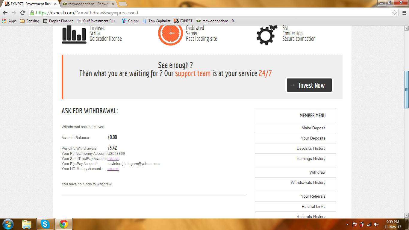 | EXNEST Exnest is a high profitable investment project.We have over 10 years working in the international currency market Forex, and offers its customers a complete package for the conduct of investment business.All the members of our team are professionals.They are constantly working on implementing unique technologies and trading schemes that allow working successfully on the market of -virtual investments in a highly successful and profitable way. |