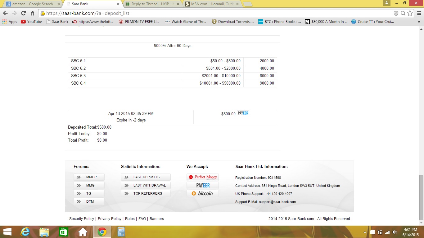 I quickly deposited $500.00!! Via Payeer. I chose the 60 day Plan that would have given me a healthy 9000% PROFIT/ $10,000. Or so I thought.