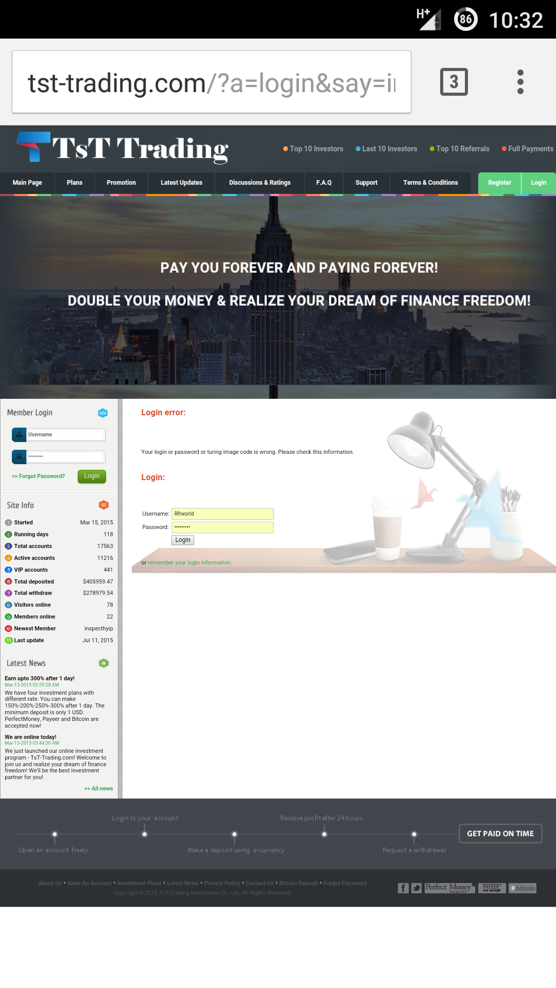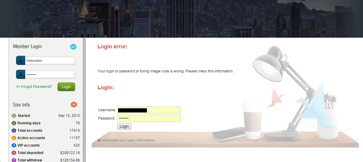 I invested $1300 in 3 days 201% option and after receiving $2600 in my acc i requested $1500 withdraw yesterday. Today i can't login to my account. Im waiting for admin replay to my email, but i doubt this will happen.