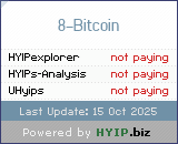 Investment: Profit in $: 10.5 Profit in %: 105.00REFERRAL COMMISSIONABOUT US8-BITCOIN is the largest investment company that works in global Bitcoin markets. Our company for a long time studies the market of investment of funds in cryptocurrencies and successfully applies acquired skills and knowledges for receiving stable profit. In order to maximize your income from cryptocurrency trading, and to provide better support to our customers, we offer the cheapest and best conditions for investment.