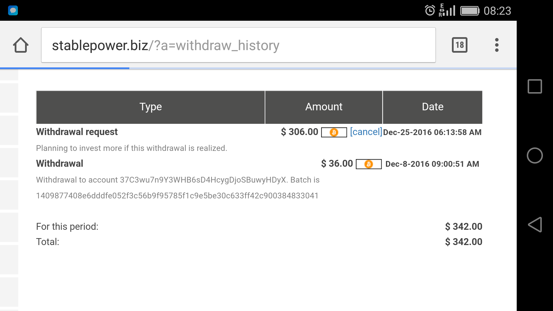 Stablepower.biz has not paid since 22nd Dec. Cancelled the withdrawal request on 25th Dec and raised request again based on "paying" report in hyipexplorer.com. But I was fooled. Screen shot of pending withdrawal page attached for reference. Invested amount is 170$. Withdrawal pending including interest 306$. Please help me in getting back atleast invested amount. Appreciate your help on this since stablepower.biz not responding to any queries. If I ask online support, they ask yo write to admin. Even admin not replying back.