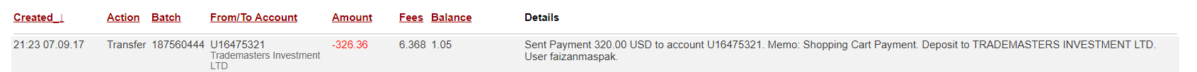 I have this prof - i Sent Payment: 320.00 USD to account U16475321 from U2640745. Batch: 187560444. Memo: Shopping Cart Payment. Deposit to TRADEMASTERS INVESTMENT LTD. User faizanmaspak .