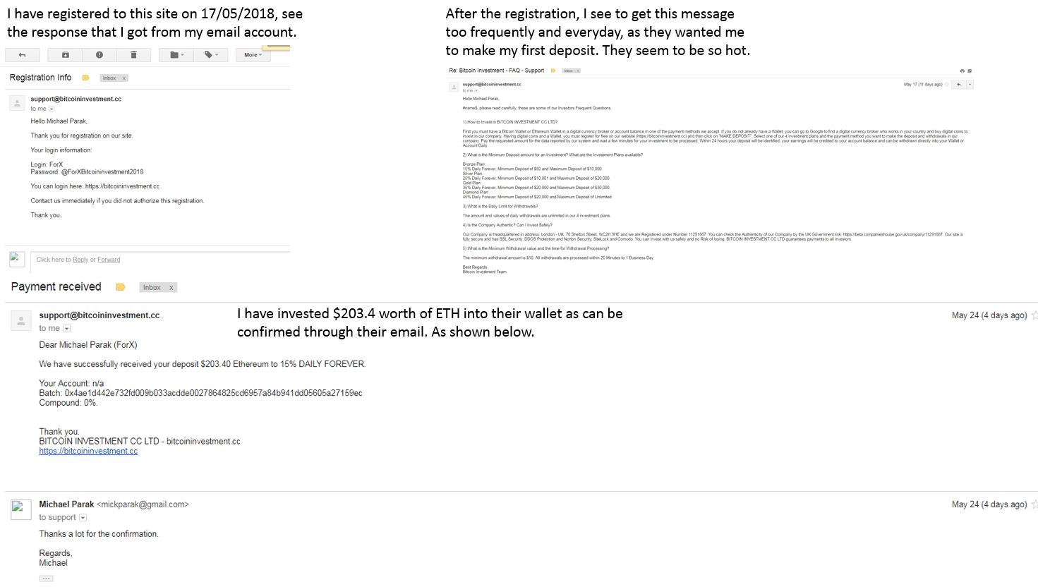 I have invested $203.4 worth of ETH into their wallet as can be confirmed through their email. As shown below.