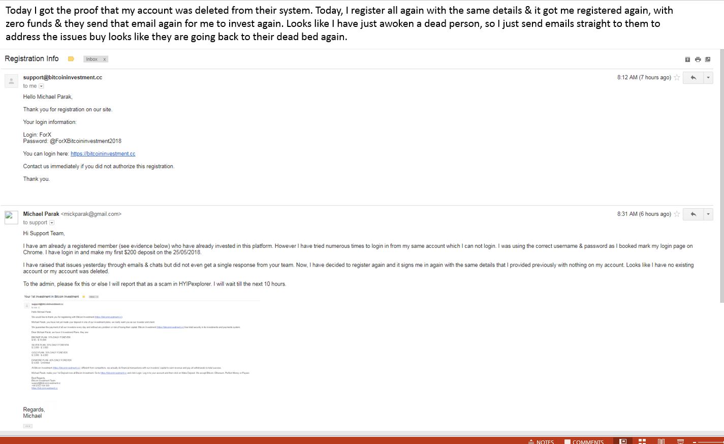 Today I got the proof that my account was deleted from their system. Today, I register all again with the same details & it got me registered again, with zero funds & they send that email again for me to invest again. Looks like I have just awoken a dead person, so I just send emails straight to them to address the issues buy looks like they are going back to their dead bed again.