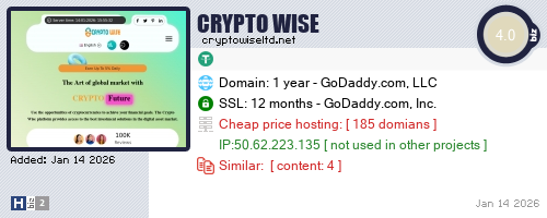 | Crypto Wise Crypto Wise Limited is a cutting-edge wealth management company designed to help individuals and institutions grow their crypto assets effortlessly through automated trading strategies. AI developers, and blockchain specialists, we have built a system that leverages advanced algorithms, market analysis, and risk management strategies to ensure stable and sustainable profits up to 5% Daily |